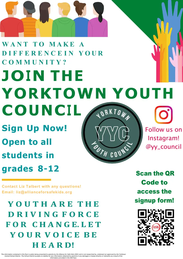 The Yorktown Youth Council meets monthly to discuss issues in the community, what can be done to improve it, and to give youth a voice in town government. If you are in grades 8-12, reside in the Town of Yorktown and would like to join the Yorktown Youth Council, please sign up here.