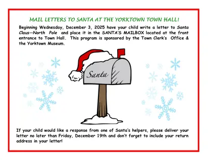 Beginning Wednesday, December 3, 2025 have your child write a letter to Santa Claus—North Pole and place it in the SANTA’S MAILBOX located at the front entrance to Town Hall. This program is sponsored by the Town Clerk’s Office & the Yorktown Museum.
