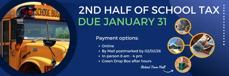 The second half of school tax is due by January 31, 2026. Because this is a Saturday, payments can be made on February 2, 2026 without penalty.