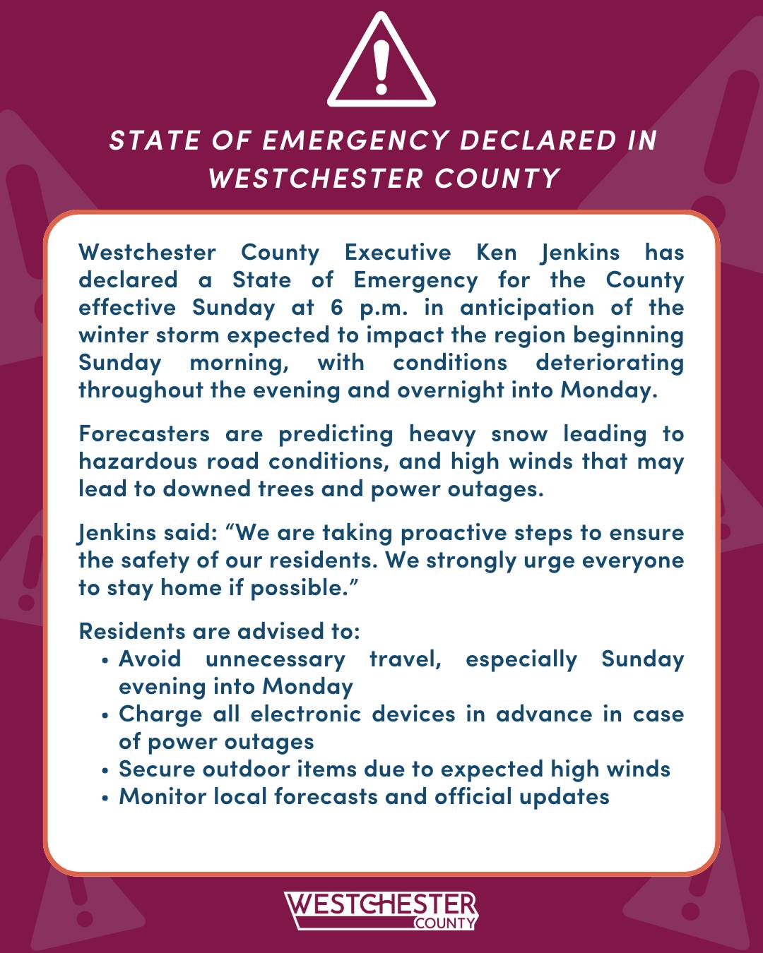 Westchester County Executive Ken Jenkins has declared a State of Emergency for the County effective Sunday, February 22, 2026 at 6:00 PM in anticipation of the winter storm expected to impact the region beginning Sunday morning, with conditions deteriorating throughout the evening and overnight into Monday.